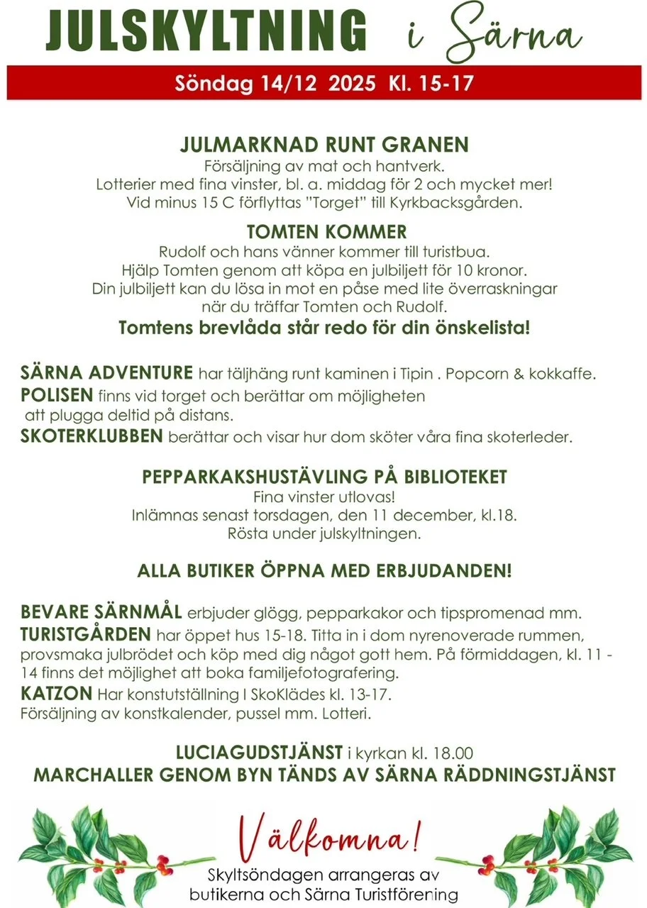 Tillbaka till alla evenemang Särnas Julskyltning söndag 14 december 2025 15:00 17:00 Google Kalender ICS